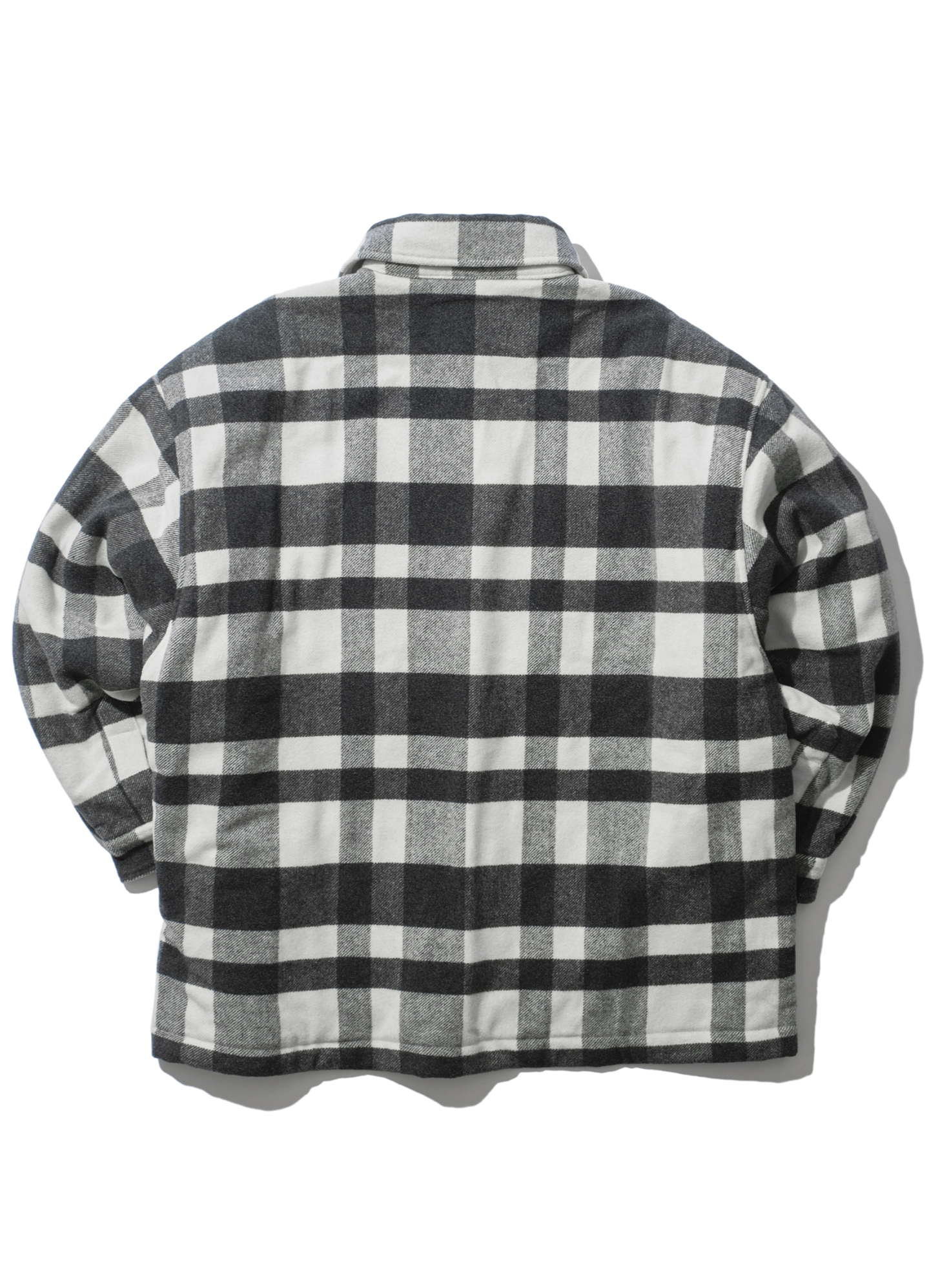 表地にRECYCTEX社のフランネル生地を使用したCUKO SHIRT JACKET。紡毛独特の柔らかな風合いと心地よい肌触りが特徴。裏地は、中綿キルティング仕様で保温性も高く冬の季節に最適な一着。オーバーサイズシルエットで、中にジャケットや厚手のセーターを着ても上から羽織れるサイズ感。