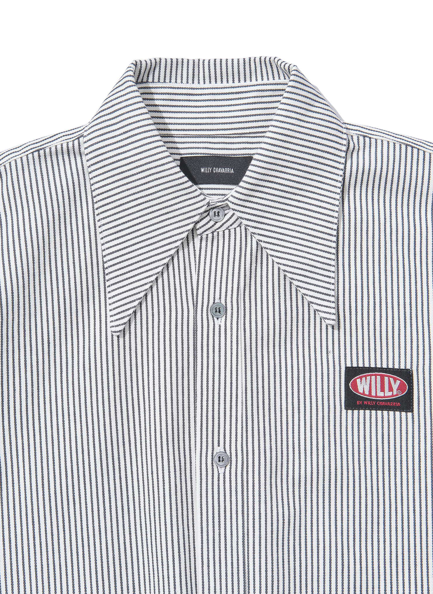 ストライプ柄にブランドパッチがアクセントのショートスリーブシャツ。ワークシャツっぽいカジュアルさにシャープな襟が、洗練されたストリートな印象を与えてくれる。