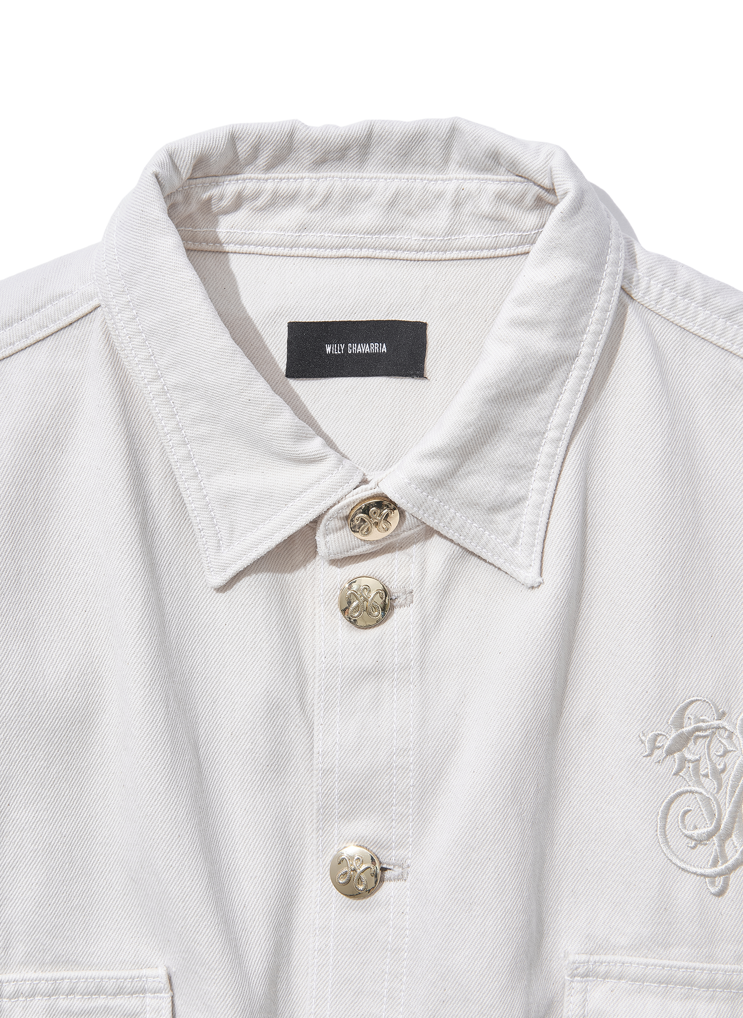 これぞまさしくショーピース。ショー以降、商品化されなかった幻のアイテム。ウォッシュド加工したデニムを仕様し、胸元には2匹のヘビをモチーフにしたWILLY CHAVARRIAロゴの刺繍と金のクレストボタン、ポケットの位置も通常より若干下めに配置。こんなシャツジャケット、マニアにはたまらないレアな逸品。
